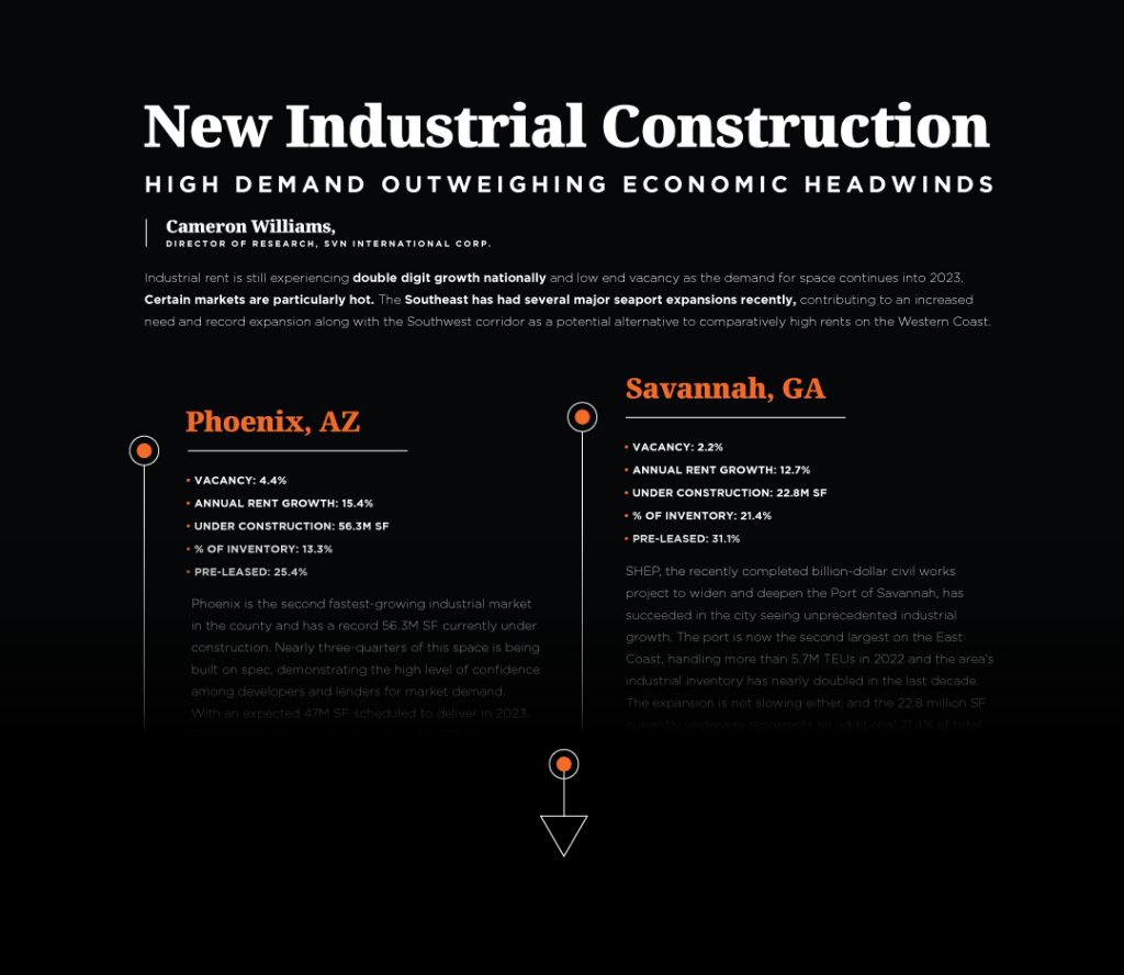 Industrial rent is still experiencing double digit growth nationally and low end vacancy as the demand for space continues into 2023. Certain markets are particularly hot. The Southeast has had several major seaport expansions recently, contributing to an increased need and record expansion along with the Southwest corridor as a potential alternative to comparatively high rents on the Western Coast.